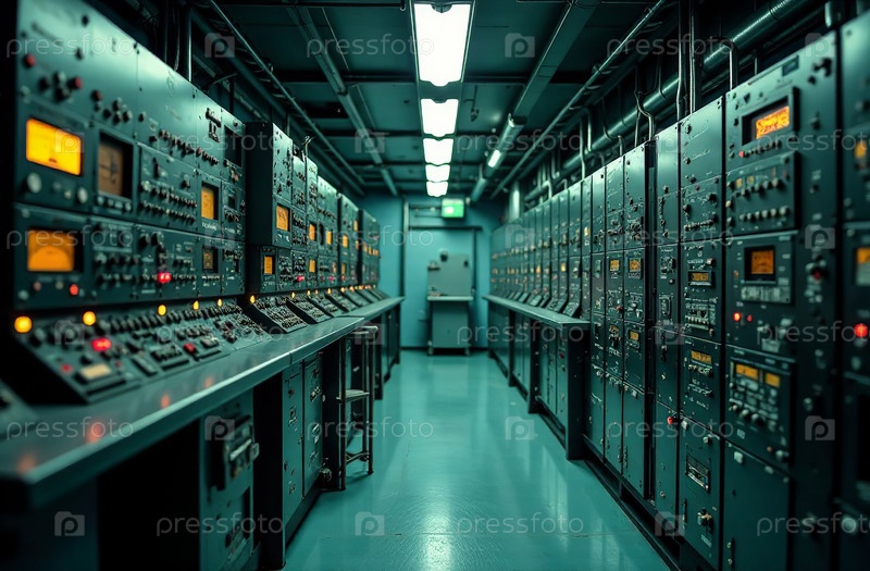 Ретрофутуристский интерьер здания, свободное пространство серверной комнаты. Генеративный ИИ