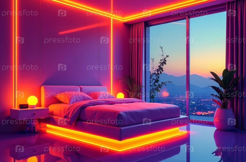 Ретрофутуристский интерьер здания, свободное пространство спальни. Генеративный искусственный интеллект