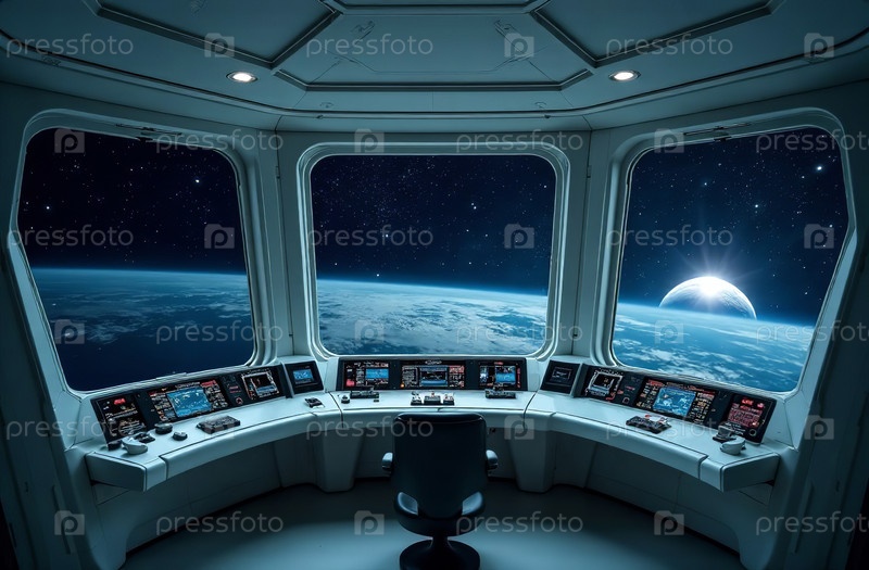 Интерьер космического корабля, космос и планеты в окне. Генеративный ИИ