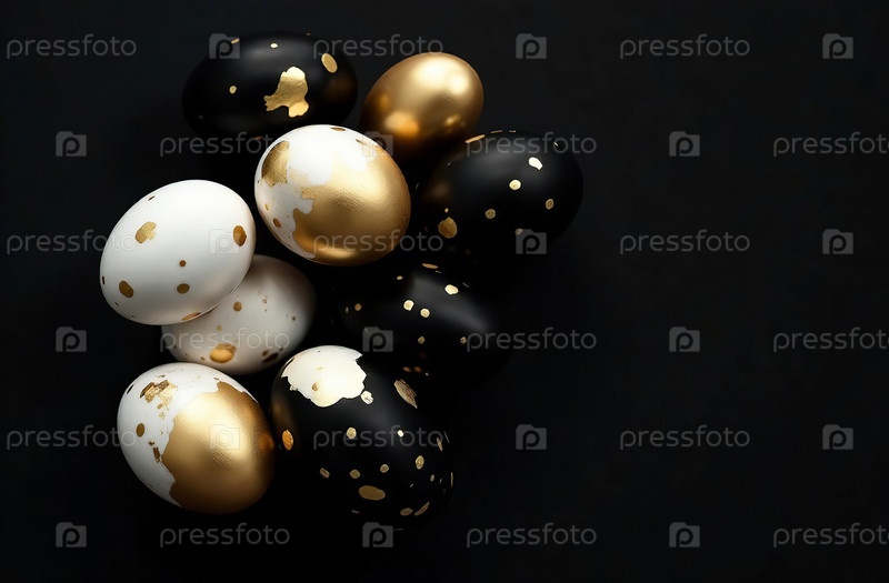 Красочные яйца с золотыми пятнами на черном фоне, пасхальная открытка. Генеративный ИИ