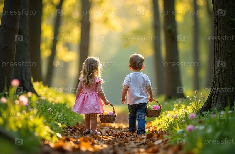 Дети собирают крашеные яйца в плетеную корзину в лесу, пасхальная открытка. Генеративный искусственный интеллект