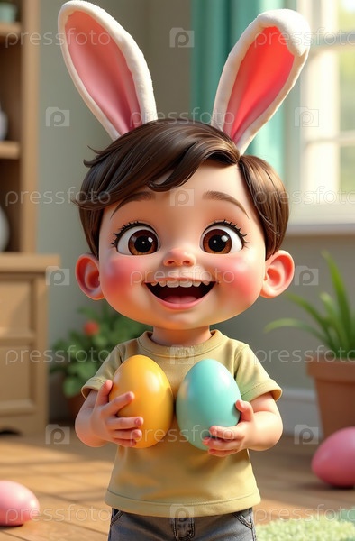 Младенец и раскрашенные традиционные яйца, пасхальная открытка. Генеративный искусственный интеллект