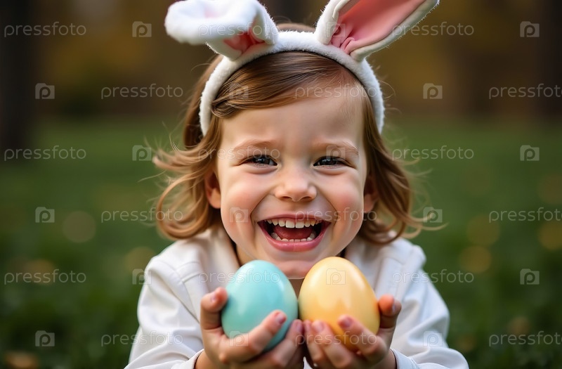 Младенец и цветные традиционные яйца на зеленом лугу, пасхальная открытка. Генеративный искусственный интеллект
