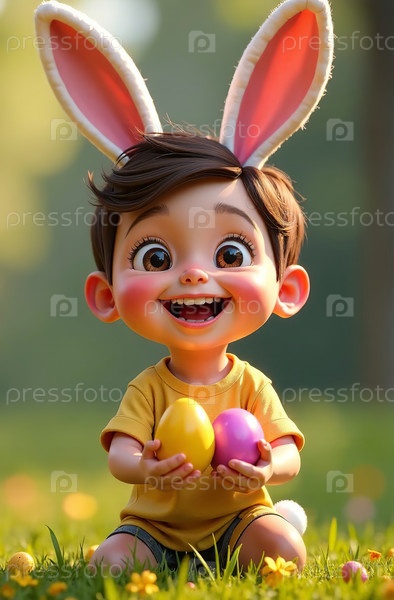 Младенец и раскрашенные традиционные яйца, пасхальная открытка. Генеративный искусственный интеллект