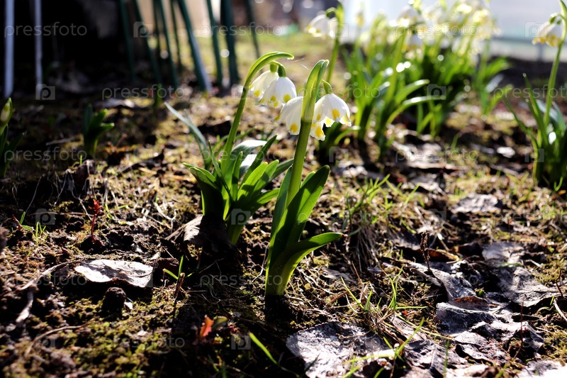 Цветы белоцветники в полутени с паутиной в солнечный весенний день