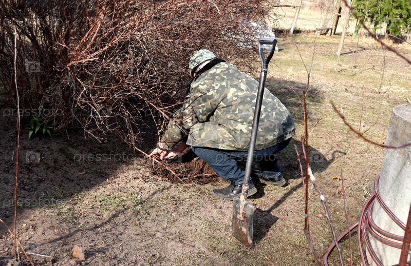 Пожилой фермер сидит на корточках, прикапывает ветви куста жимолости и присыпает их землей