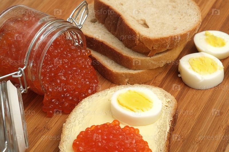 Сэндвич с красной икрой и яйцом в разных ракурсах