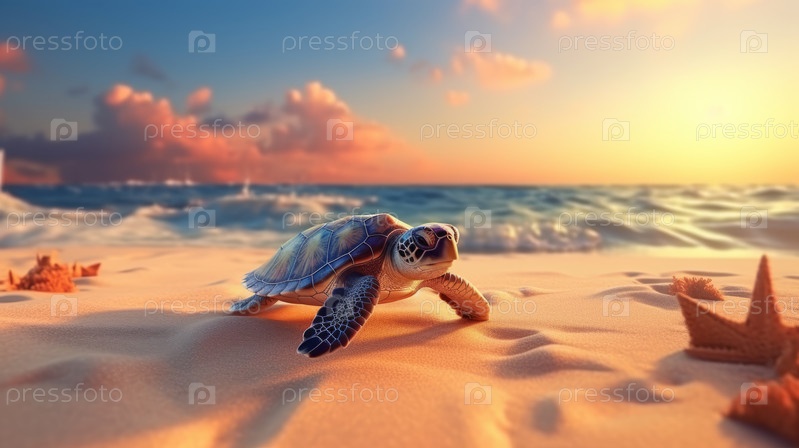 Маленькая морская черепаха на песчаном пляже утром