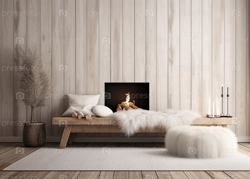 Белый угловой диван возле камина. Скандинавский дизайн интерьера современной гостиной