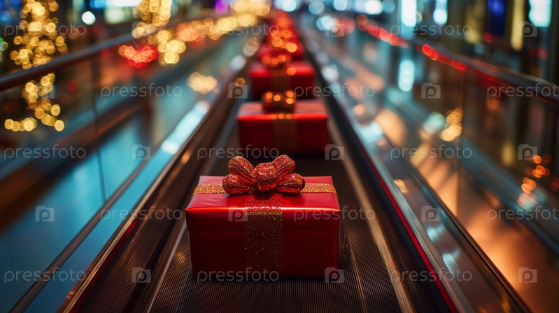 Красочные подарки движутся по конвейерной ленте в окружении сверкающих праздничных огней и украшенной рождественской елки, создавая праздничный дух