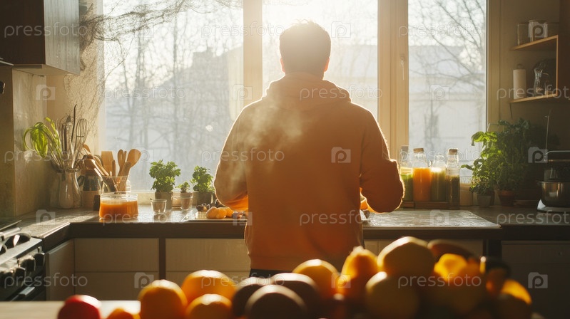 Уютная кухня с мужчиной, наслаждающимся утренним кофе