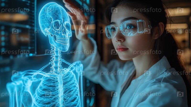 Молодая женщина изучает высокотехнологичный голографический скелетный дисплей в футуристической медицинской среде