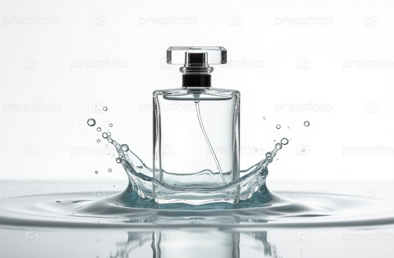 Макет прозрачной стеклянной упаковки флакона духов с белыми брызгами воды. Генеративный искусственный интеллект