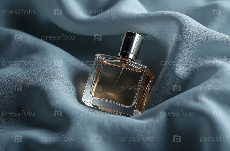 Макет прозрачной стеклянной упаковки для духов в серой ткани. Генеративный искусственный интеллект