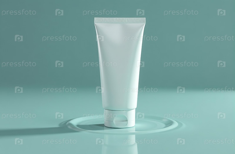 Макет белой тюбиковой бутылки с косметической баночкой в воде на синем фоне. Генеративный искусственный интеллект