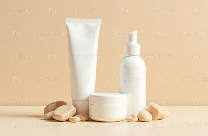 Макет белой тюбиковой косметической баночки на бежевом фоне. Генеративный искусственный интеллект