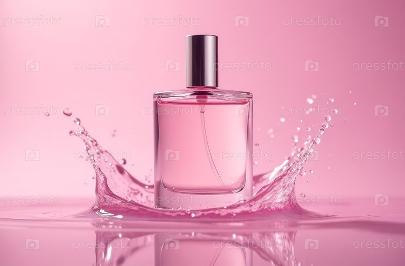 Макет прозрачной стеклянной упаковки флакона духов розового цвета с брызгами воды. Генеративный искусственный интеллект