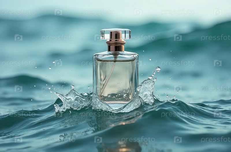 Макет прозрачной стеклянной упаковки для духов в морской волне. Генеративный искусственный интеллект