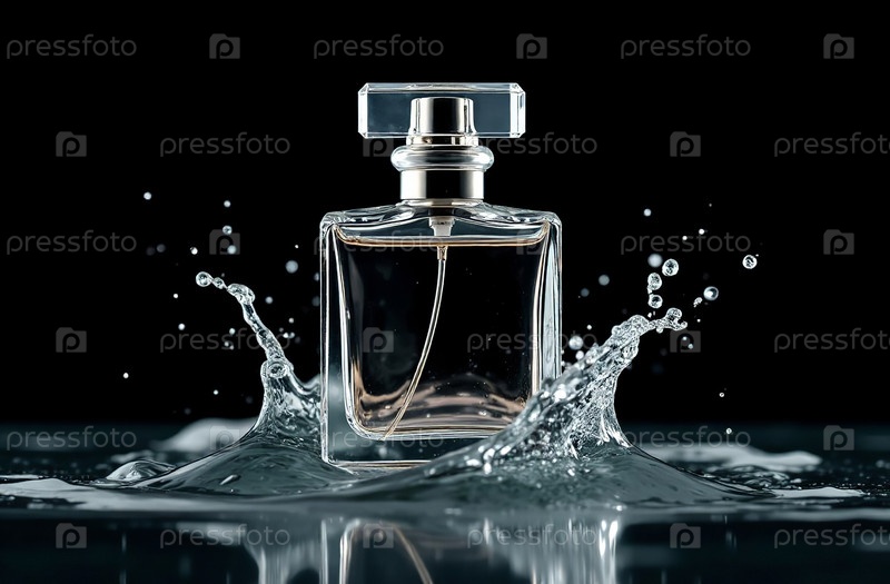 Макет Прозрачная стеклянная упаковка Флакон духов спрей черный фон AI Generative