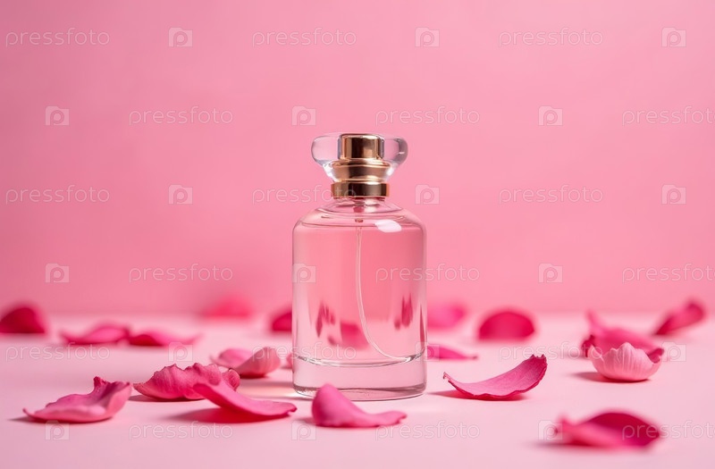 Макет прозрачной стеклянной упаковки для духов с розовыми лепестками роз. Генеративный искусственный интеллект