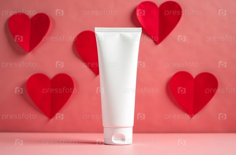 Макет Белая тюбик Бутылка Косметическая банка фон красные бумажные сердечки. Генеративный искусственный интеллект