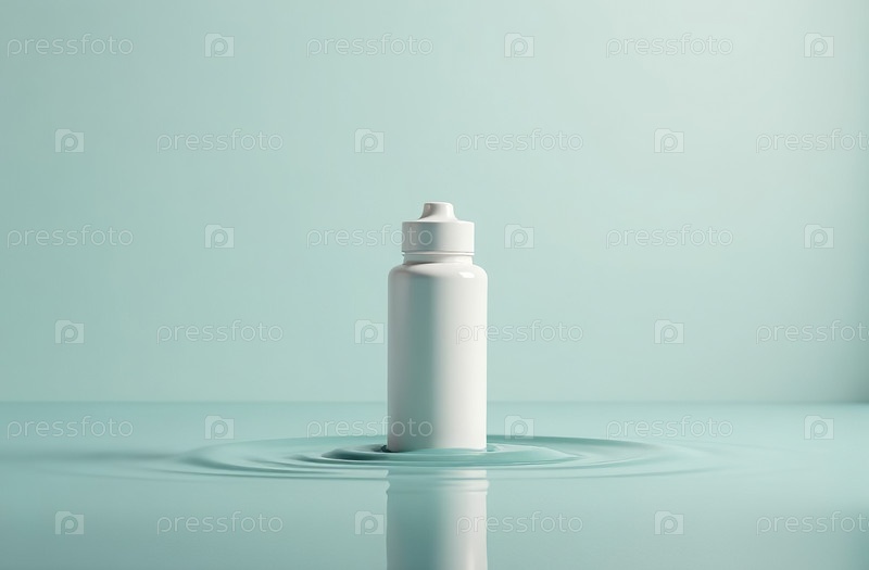 Макет белой тюбиковой бутылки с косметической баночкой в воде на синем фоне. Генеративный искусственный интеллект