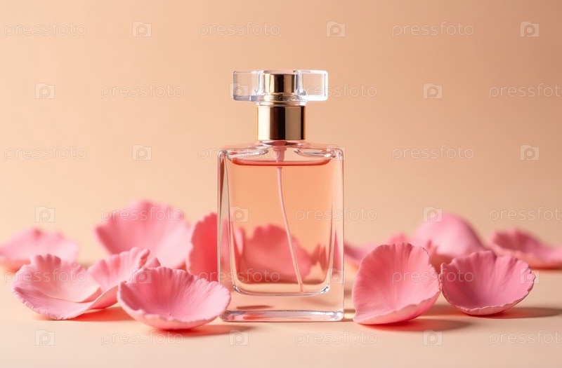 Макет прозрачной стеклянной упаковки для духов с розовыми лепестками роз. Генеративный искусственный интеллект
