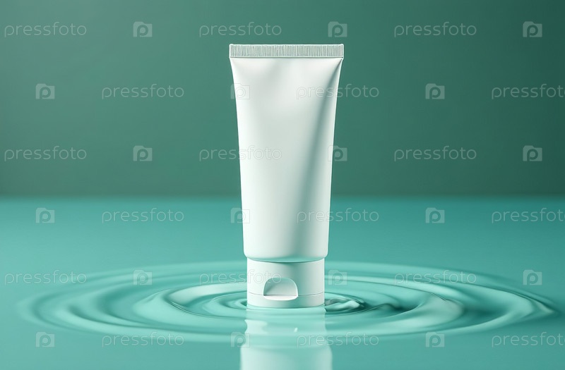 Макет белой тюбиковой бутылки с косметической баночкой в воде на синем фоне. Генеративный искусственный интеллект