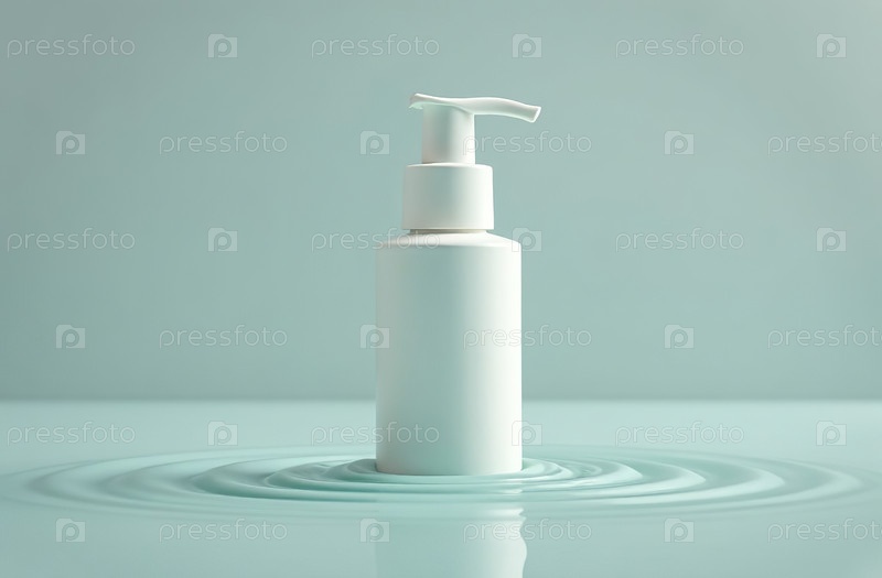 Макет белой тюбиковой бутылки с косметической баночкой в воде на синем фоне. Генеративный искусственный интеллект