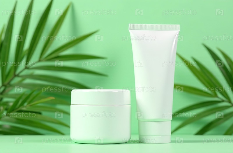 Макет белой тюбиковой бутылки косметической банки на фоне зеленых листьев. Генеративный искусственный интеллект