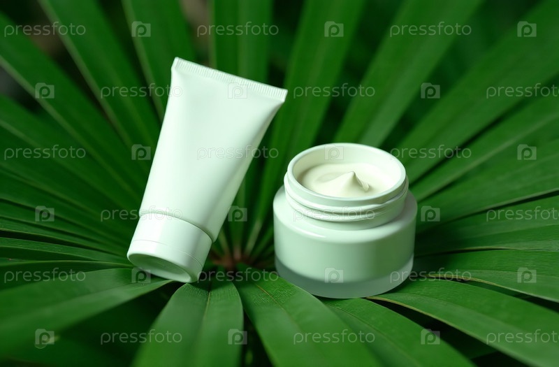 Макет белой тюбиковой бутылки косметической банки на фоне зеленых листьев. Генеративный искусственный интеллект