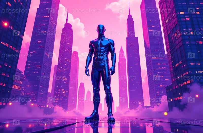 Человек на фоне Футуризм кибергород, панорама виртуальная реальность. Генеративный ИИ