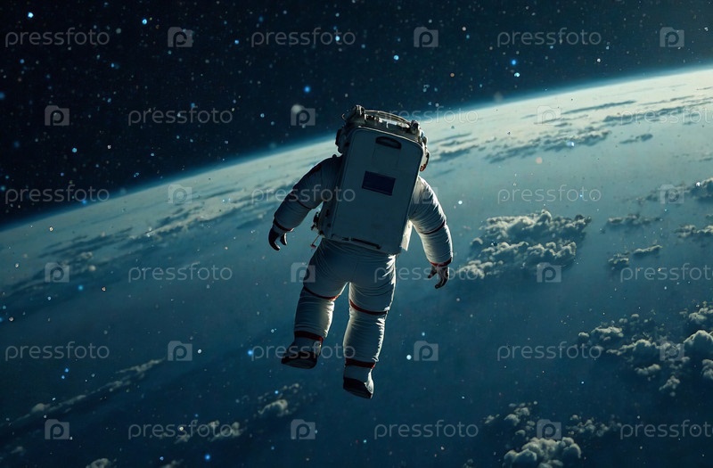 Астронавт в скафандре в открытом космосе летает в условиях невесомости. Генеративный искусственный интеллект