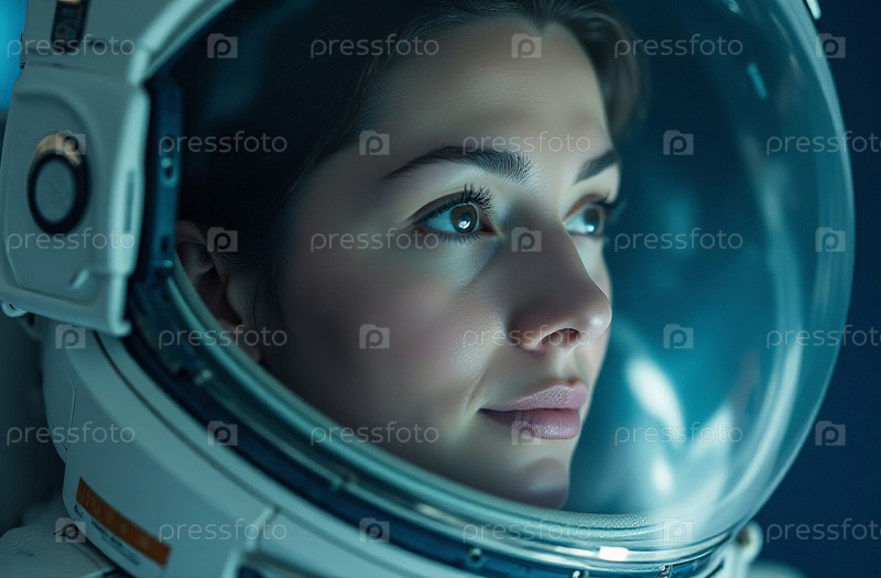 Портрет женщины-астронавта в шлеме скафандра на фоне космоса. Генеративный искусственный интеллект