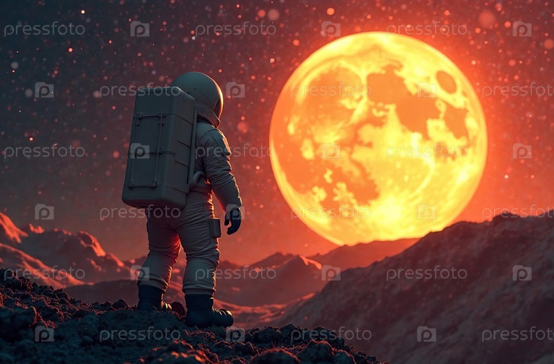 Астронавт стоит на земле планеты и смотрит на большой спутник космоса Генеративный ИИ