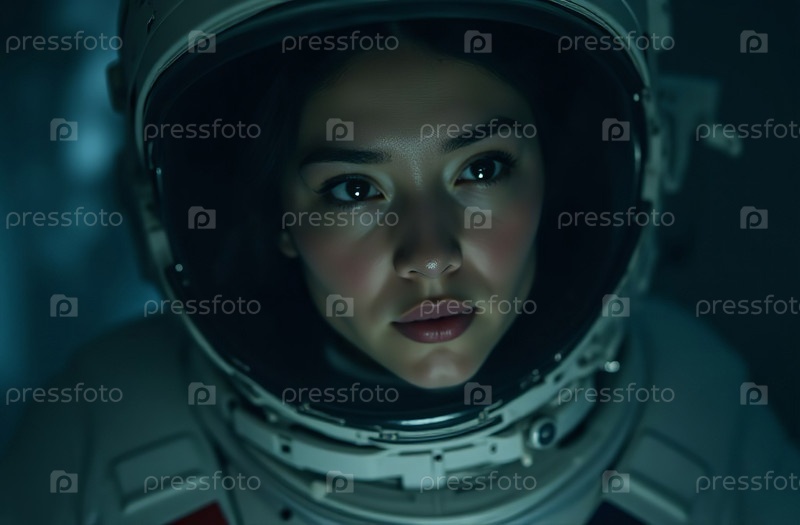 Портрет женщины-астронавта в шлеме скафандра на фоне космоса. Генеративный искусственный интеллект