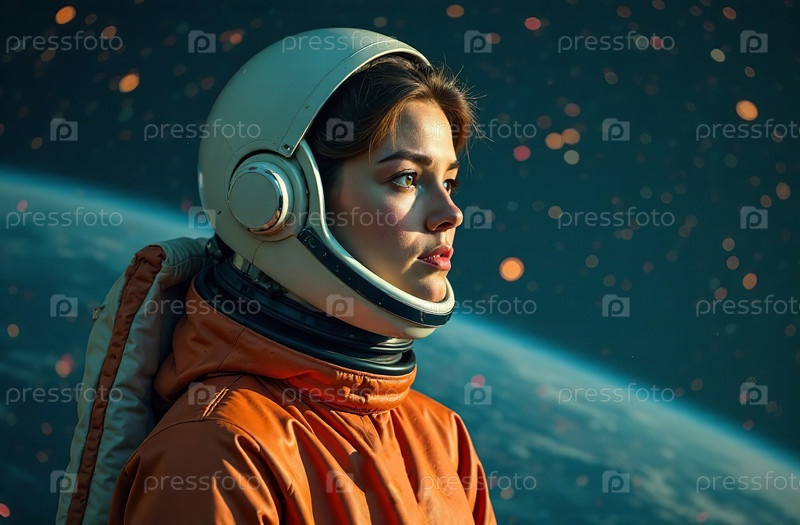 Портрет женщины-астронавта в шлеме скафандра на фоне космоса. Генеративный искусственный интеллект