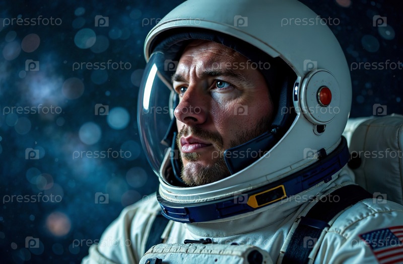 Портрет мужчины-астронавта в шлеме скафандра на фоне космоса. Генеративный искусственный интеллект