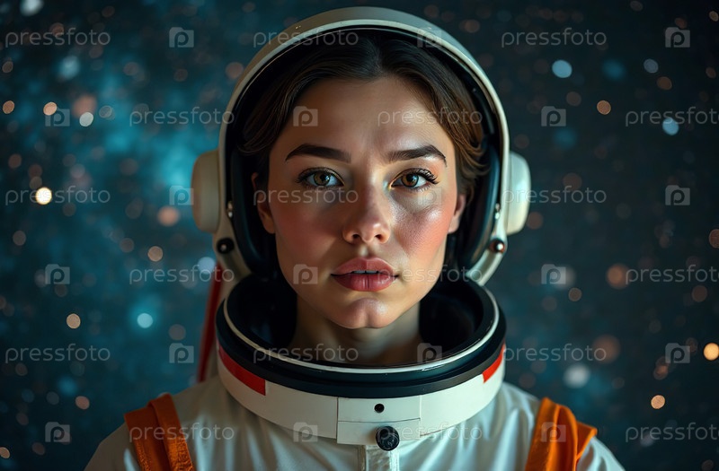 Портрет женщины-астронавта в шлеме скафандра на фоне космоса. Генеративный искусственный интеллект