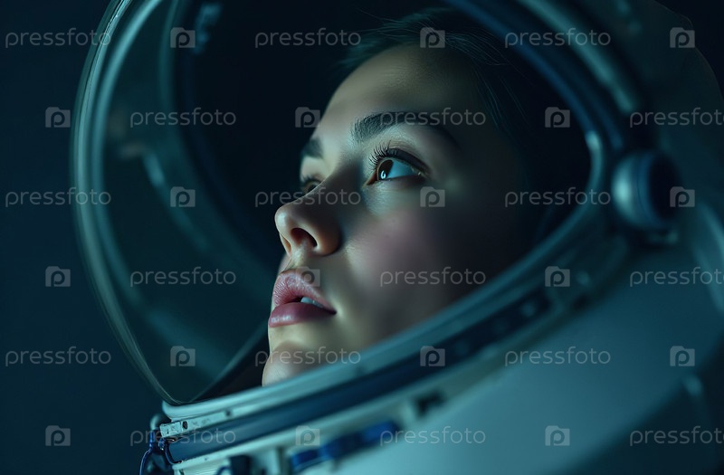 Портрет женщины-астронавта в шлеме скафандра на фоне космоса. Генеративный искусственный интеллект