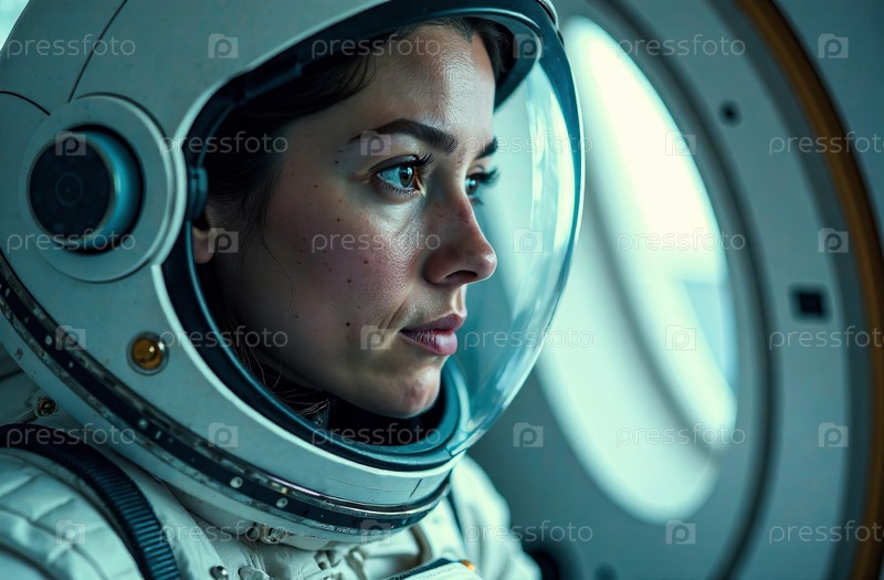Портрет женщины-астронавта в шлеме скафандра на фоне космоса. Генеративный искусственный интеллект