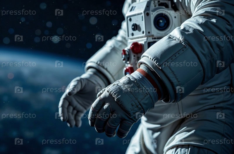 Астронавт скафандр открытый космос летит невесомость крупным планом руки. Генеративный искусственный интеллект