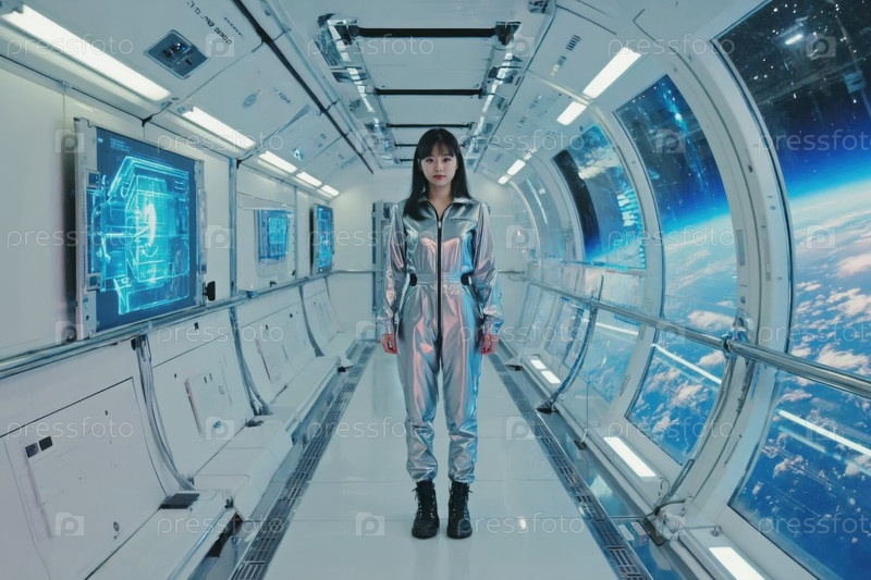 Скафандр и шлем астронавта в космическом корабле, вид из окна. Генеративный искусственный интеллект