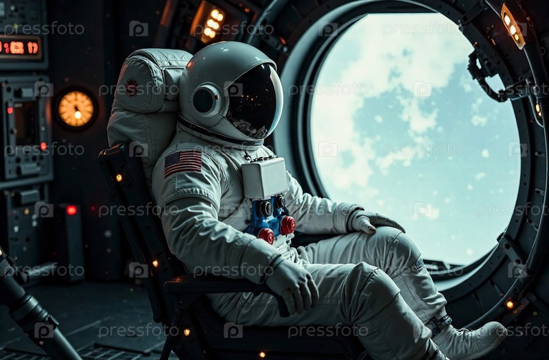 Скафандр и шлем астронавта в космическом корабле, вид из окна. Генеративный искусственный интеллект