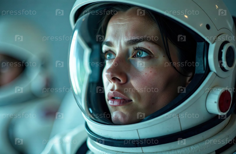 Портрет женщины-астронавта в шлеме скафандра на фоне космоса. Генеративный искусственный интеллект