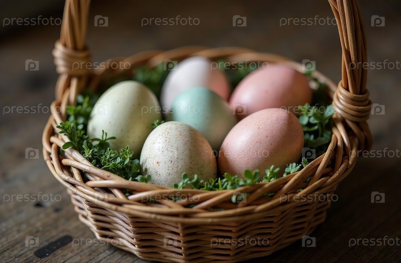 Красочные яйца в плетеной корзине Пасхальная открытка Фон Генеративный ИИ