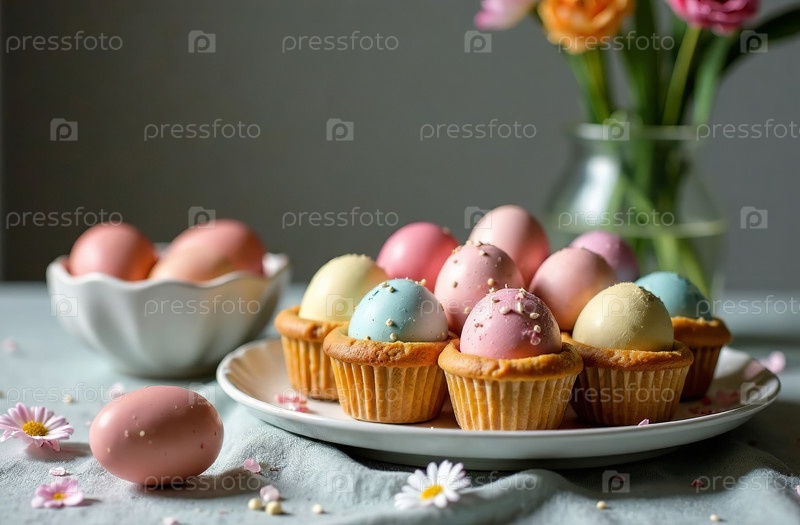Пасхальная выпечка с крашеными яйцами на украшенном столе. Генеративный искусственный интеллект