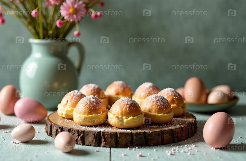 Пасхальная выпечка с крашеными яйцами на украшенном столе. Генеративный искусственный интеллект