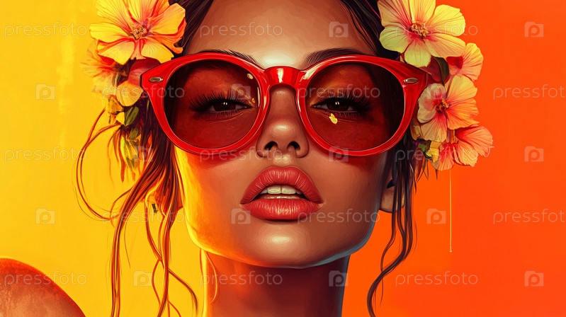 Яркий портрет с цветочным головным убором на оранжевом фоне