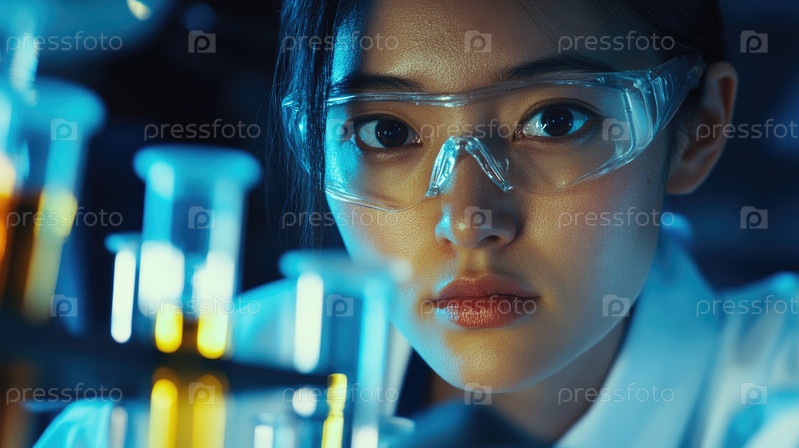 Ученый проводит эксперимент в лаборатории с различной стеклянной посудой